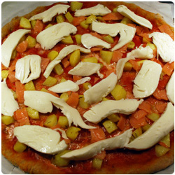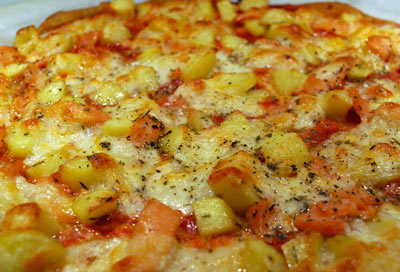 Ingredients- 450g (1lb) of pizza dough - oven potatoes (look recipe here) - 200g of smoked salmon - 200g of tomato sauce - 50 ml of whipping cream - oregano |