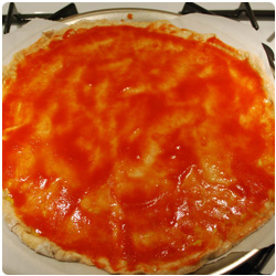 Once the dough is about the same size of the tray pour the olive oil and the tomato sauce on the dough, paying attention to spread them on the crust. |