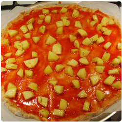 Spread the tomatoe sauce with oil on top of the pizza. Add the potatoes and the whipping cream. |