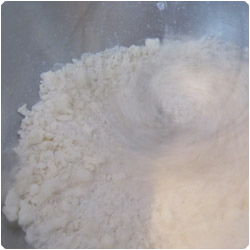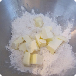 Add the butter in the bowl and mix it with the flour with a mixer until you don't have big pieces of butter. |