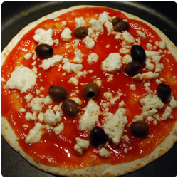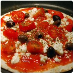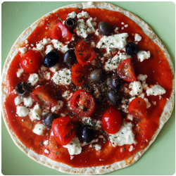 Ingredients- 1 soft tacos or piadina - tomato sauce - feta cheese - 3 cherry tomatoes - black olives - oregano |