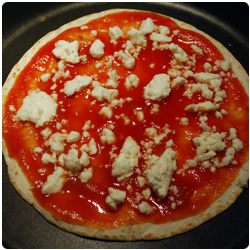 Warm up a pan. Put the soft tacos in it. When one side is warm, flip it and put the fire low. Add the tomato sauce and the feta. |
