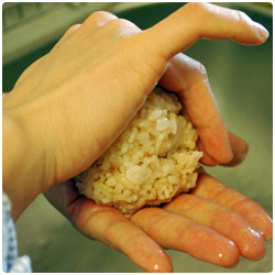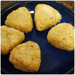 Divide the rice in 6 parts. With wet hands make 6 triangle shape balls (like in the pictures). |