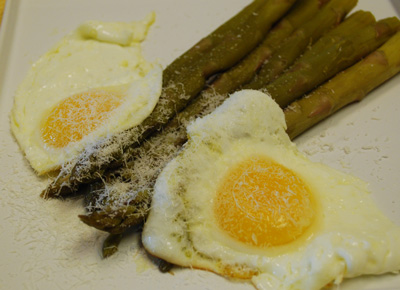 When the white of the eggs is cooked (but the yolks are still liquid), put them on the top of the asparagus. Spread some gratered parmesan on top. |
