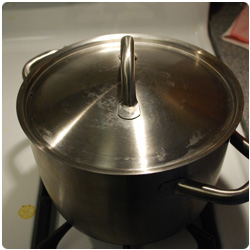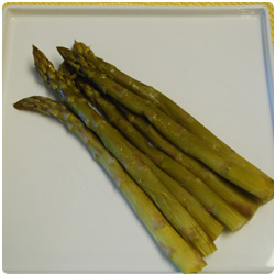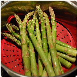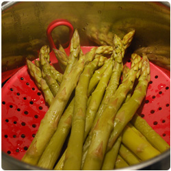 Cover the pot and bring the water to a boil. Steam cook the asparagus for about 30 min. Depending on the size of the asparagus, it can take longer. When the asparagus are tender, turn the heat off. |