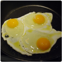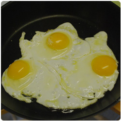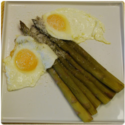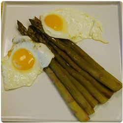 Put a bunch of asparagus in a plate. In a pan warm up 2 tablespoons of olive oil and fry the eggs without breaking the yolks. |