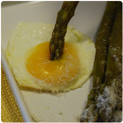 Don't forget to deep the head of the asparagus in the yolk, it's the fun part! Serve warm. |