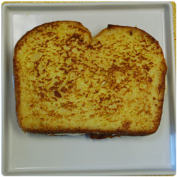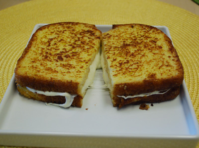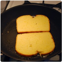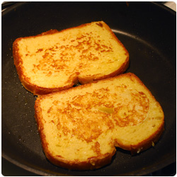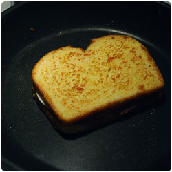 Heat 2 tablespoons of olive oil in a non-stick pan and place 2 slices of egg-soaked bread. Let them cook at medium heat for a few min. Flp them over and add mozzarella slices on top of one of the slices. |