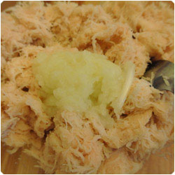 Smash the garlic and add it to the onion in the potato bowl. Add the eggs. |