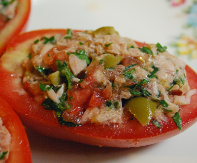Fill the tomatoes with the tuna mixture. Serve cold. |