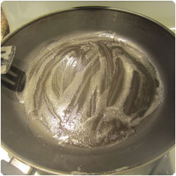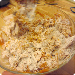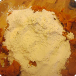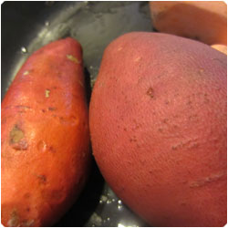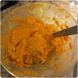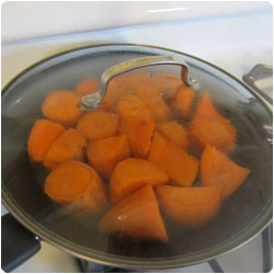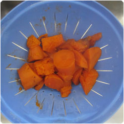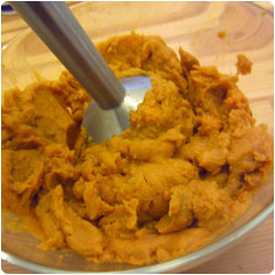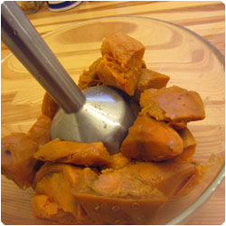 Peel the sweet potatoes and cut into quartes. Steam in covered pot with very little water for about 45min until very soft. |