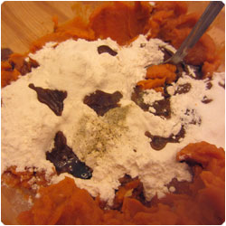 Mash the potatoes with a blender or in a food processor. Add flour, |