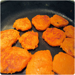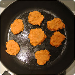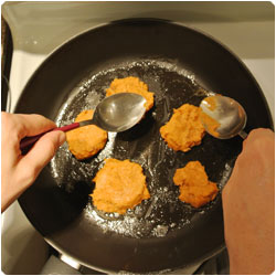 Heat oil or butter in a non-stick frying pan over medium-low heat. Place small amoutns of mixture in the pan using 2 spoons. Surface patties a little bit. |