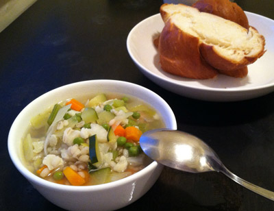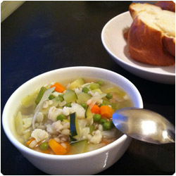 Ingredients- 240-250 gr pearl barley - 1 leek - 1 zucchini - 1-2 carrots - 1/2 cauliflower - 3 pieces celery - 1/2 onion - 1-2 cup peas - 1 tblsp of soup stock - water - salt and pepper - parmigiano or pecorino |