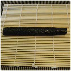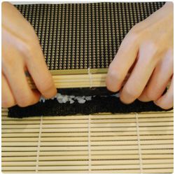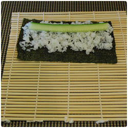 Cut out the wet seeds part of the cucumber. Place the seaweed on your bamboo sushi-mat. Wet your fingers with water, so the rice won't attach to your fingers. |