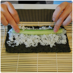 Put one sliced cucumber on the rice and roll it up like in the pictures! First roll the part with the rice and press it. |