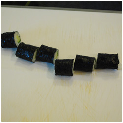 Open the sushi-mat. Wait a couple minutes to make maki stable, and then cut maki to 6-8 pieces, remeber to wet the knife with water while you are cutting it so the rice won't stick on it. Serve cold. |